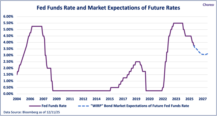 1. Interest rates: Interest rates are a mundane but essential topic that global markets focus on acutely, particularly in times of uncertainty. Lower rates generally mean less expensive capital for companies to fund projects and hire employees, and for individuals financing purchases (i.e., houses, cars, etc.). Current expectations are shown in the graph below, with the market expecting the Federal Reserve (the “Fed”) to cut rates by 0.25% - 0.50% to settle in the low 3% range in 2026. In general, the Fed only has a degree of control over short-term interest rates, whereas longer term rates are often influenced by a host of separate factors. In truth, however, even short-term interest rates are subject to market forces, dictated by how investors expect the future to unfold. Regardless, the direction of interest rates is a critical input to watch in 2026.