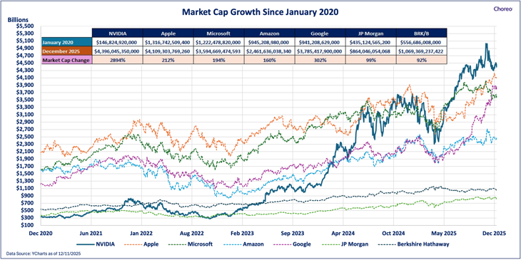 3. Nvidia (and the other 6): In January of 2020 amidst the COVID pandemic, Nvidia had a market capitalization of $150 billion. Very few outside of the technology or investment landscape had even heard of the company. Today, companies valued around $150 billion include Capital One, Boeing, Pfizer and Adobe, generally considered household names.  As of December 9, 2025, Nvidia has a market capitalization of $4.5 trillion and is the largest publicly listed company in the world. It has led a group of large companies affectionately known as the Magnificent 7 (“mag 7”), including Alphabet (the parent company of Google), Apple, Microsoft, Meta (the parent company of Facebook and Instagram), and Tesla.  Nvidia didn’t exactly come out of nowhere, but its semiconductor chips have now become essential to the ongoing AI boom.   As of the end of November, these companies represent roughly 35% of the S&P 500. Naturally, how they perform can impact broader market returns. Nvidia alone accounts for just under 8% of the index. In other words, if these companies continue to grow and do well, markets could react favorably, and vice versa. Their size alone (in excess of $1 trillion, which was believed to be an almost unattainable benchmark not too long ago) makes them worth attention in 2026.
