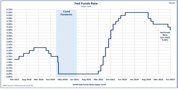 - Labor markets showing signs of strain pushed the Federal Reserve (the “Fed”) to resume its rate-cutting campaign.