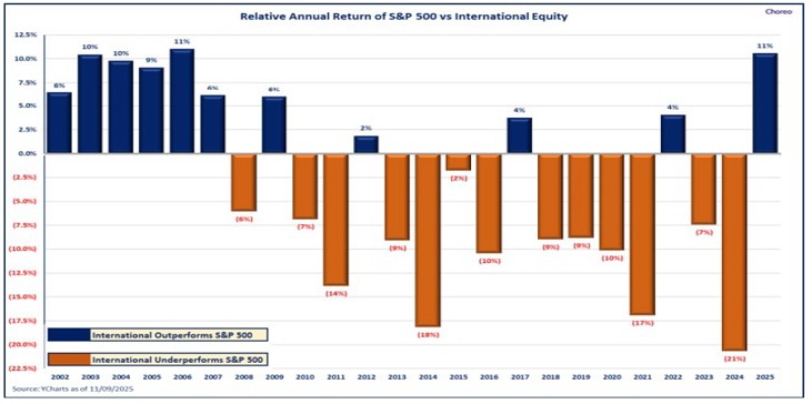 For the first time seemingly in forever, international developed and emerging stocks are having a moment. The primary international indices surged well ahead of U.S. markets this year due in part to U.S. dollar weakness as well as other factors. For the globally diversified investor, the outcome boosted 2025 performance.